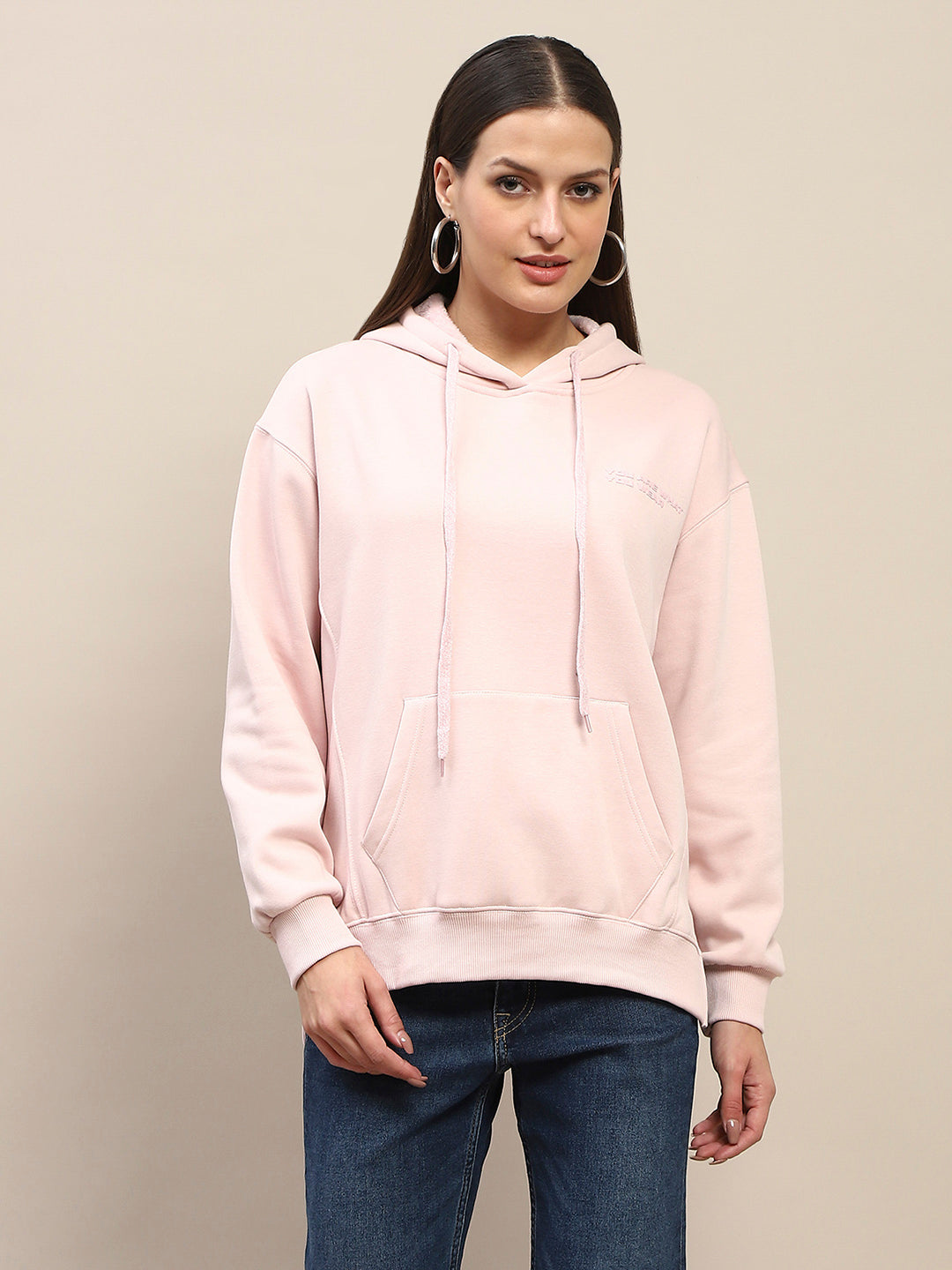 Madame Solid Light Pink Crew Neck Cotton Sweatshirt