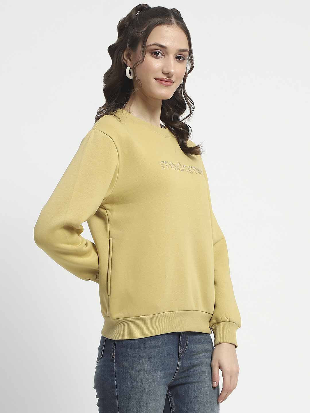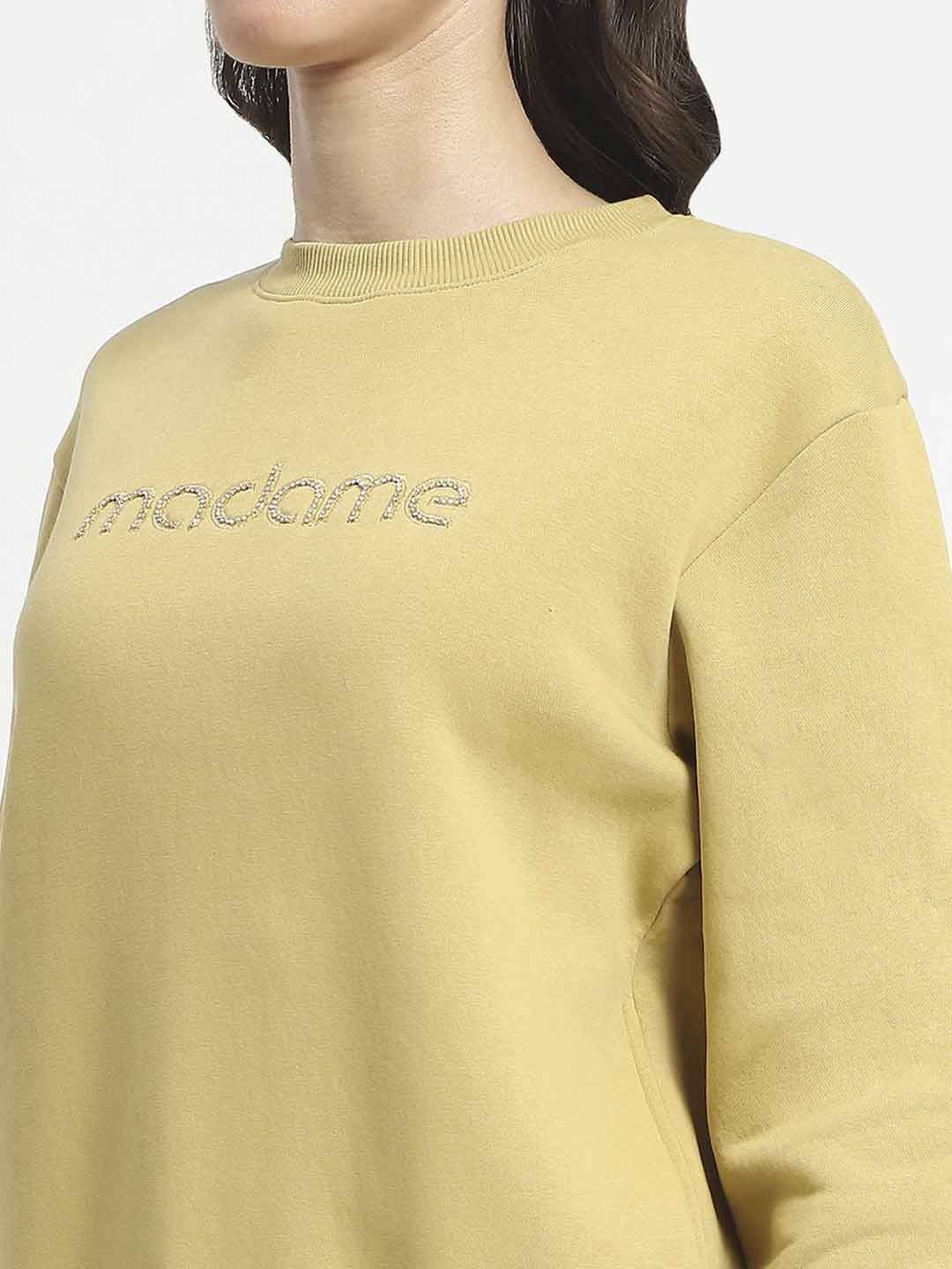 Madame Fleece Handwork And Embroidered Golden Yellow Sweatshirt For Women