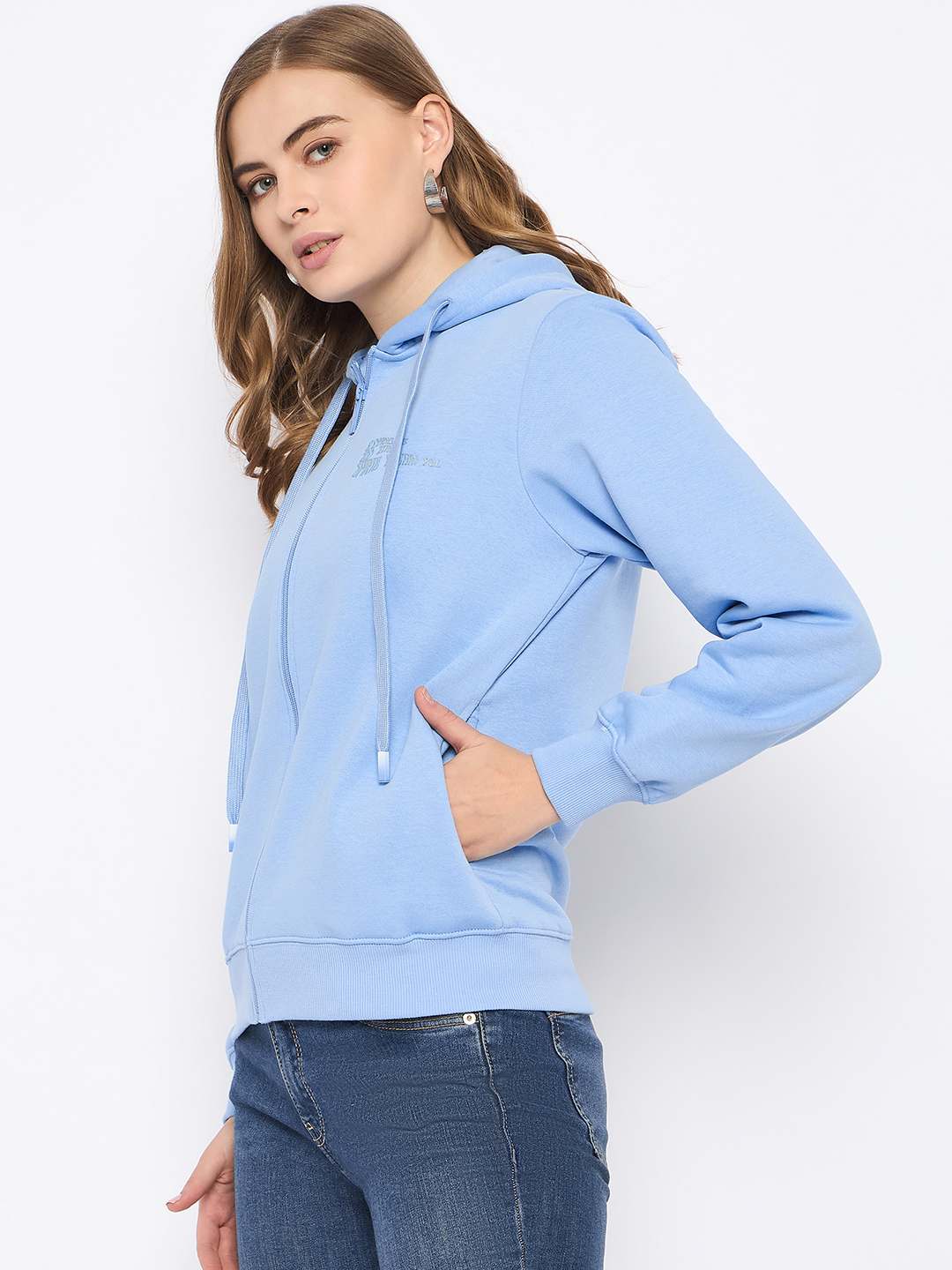 Crafted from soft, high-quality fleece, this sweatshirt offers warmth and coziness, making it the perfect choice for chilly days. The trendy powder blue hue adds a refreshing pop of color to your wardrobe, while the eye-catching placement print gives it a modern and artistic flair. The full-length zipper allows for easy layering and a customizable fit, while the spacious hood adds an extra layer of warmth and versatility. Whether you’re lounging at home or stepping out for a casual outing, this hoodie is designed to keep you comfortable and stylish. Perfect for any casual wardrobe, it pairs well with jeans, leggings, or sweatpants.