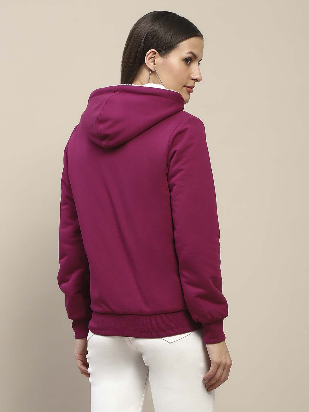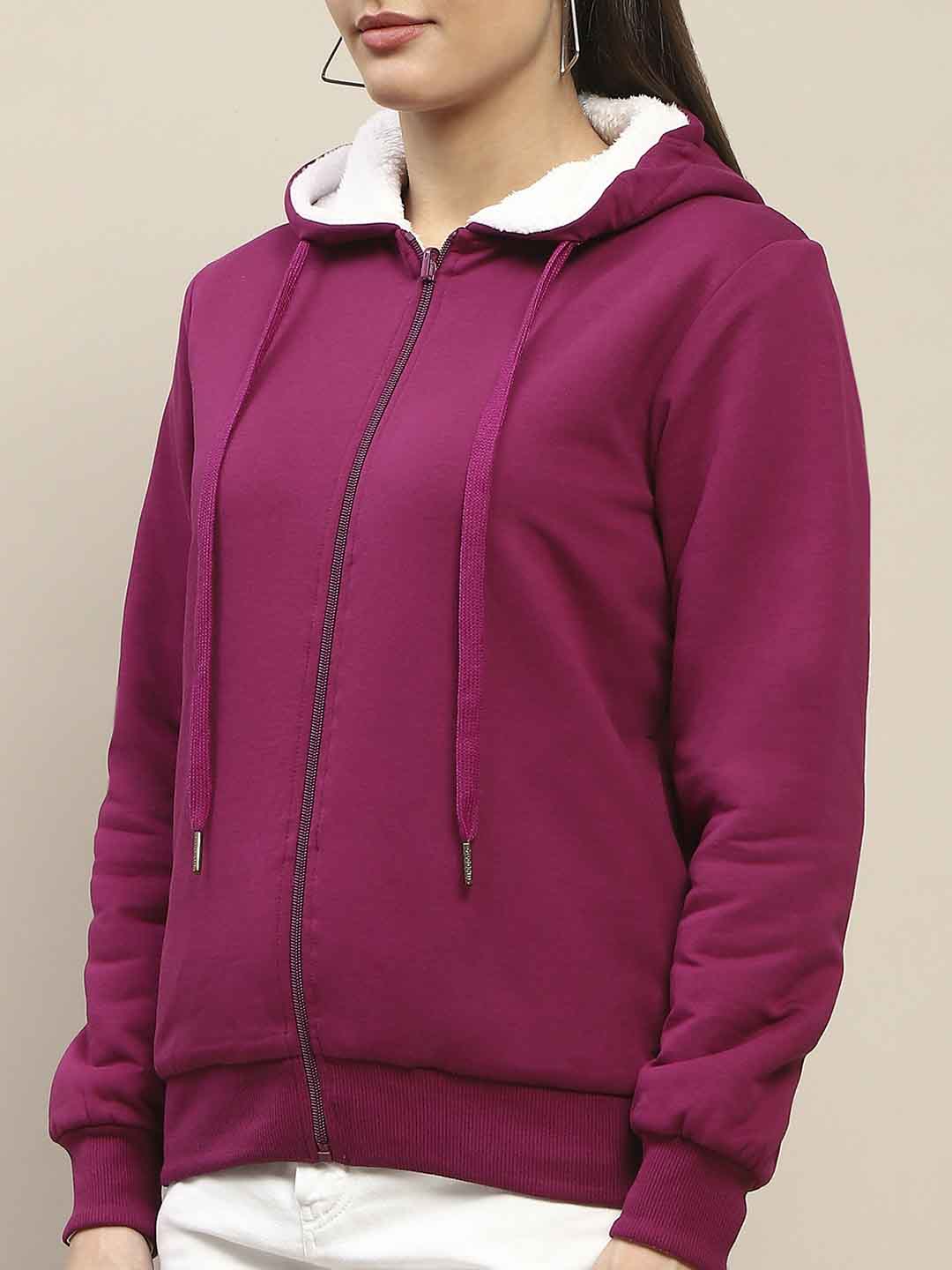 This sweatshirt features a rich plum color that adds a touch of sophistication to your everyday look. The standout feature is the luxurious fur-lined hood, which not only provides warmth but also adds a chic flair. The metal detailing along the zipper and pockets gives it an edgy twist, making it a versatile piece that can easily transition from a cozy day at home to a night out with friends. The soft fabric ensures you stay comfortable, while the fitted design flatters your silhouette.
