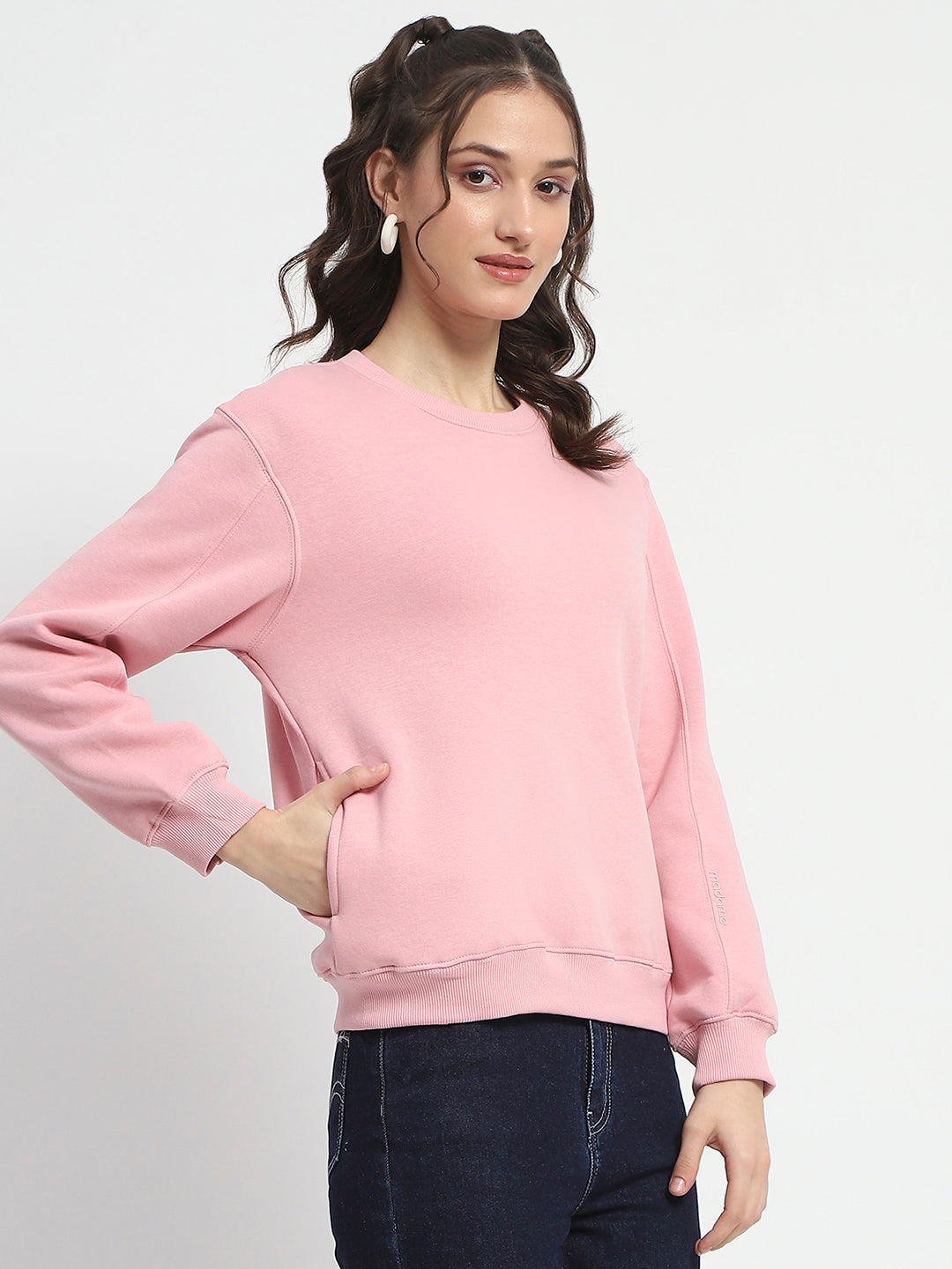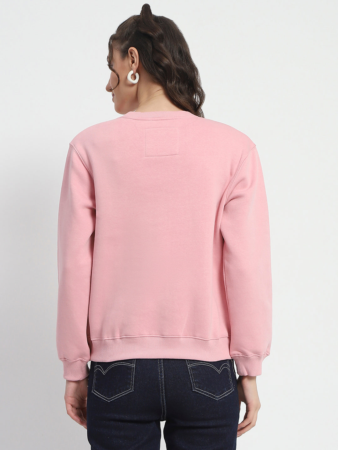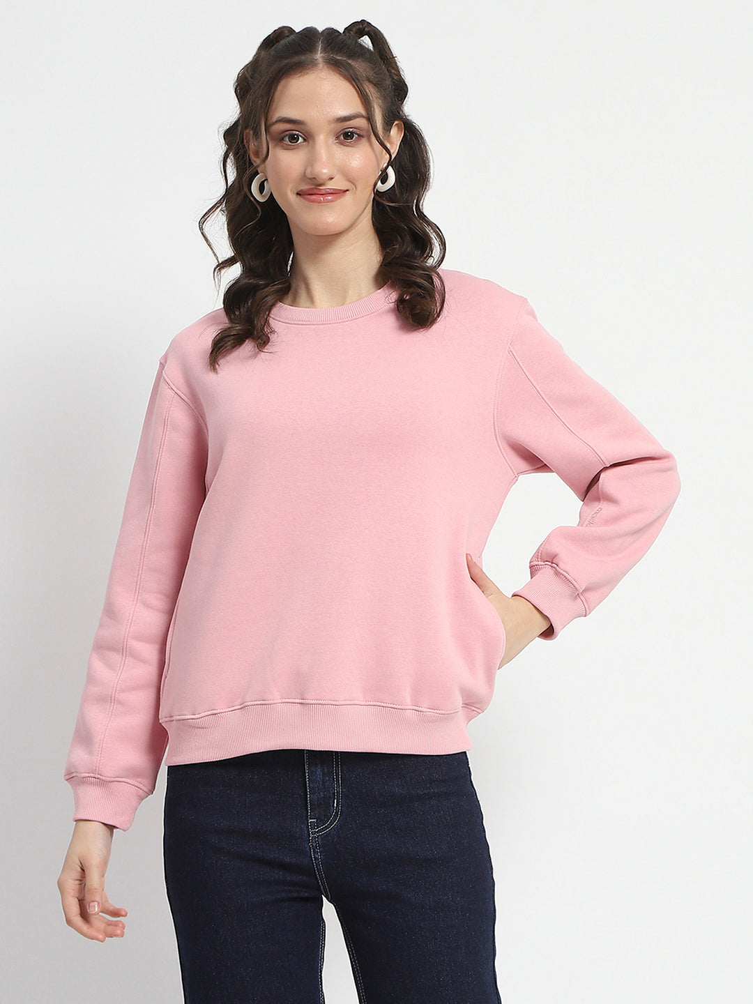 Madame Solid Light Pink Crew Neck Cotton Sweatshirt